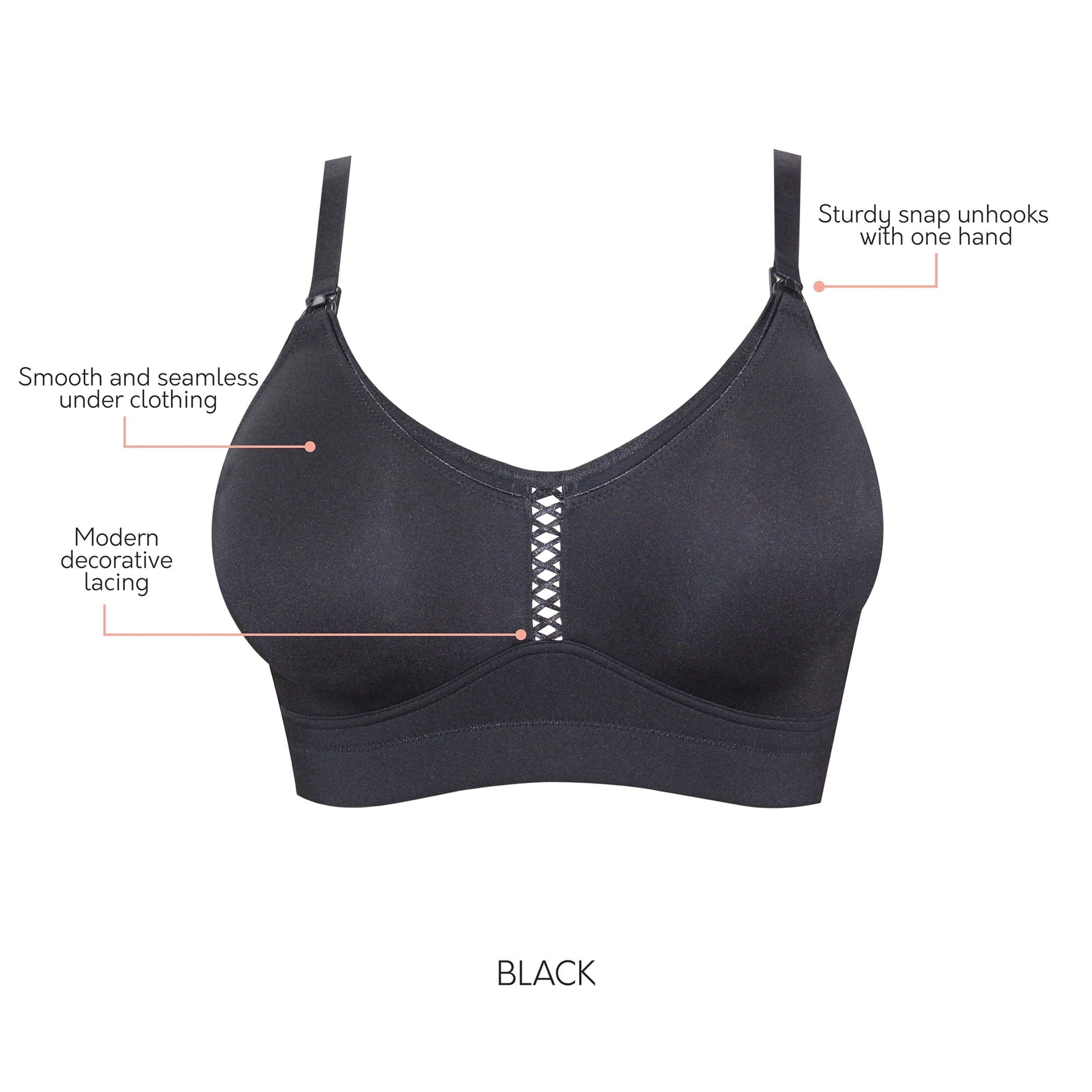 The seamless wire-free design looks and feels smooth under clothing, perfect for moms on the go. The circular inner sling adds support while the nursing clips unsnap with one hand for nursing. The microfiber cup and back with enclosed bottom band elastic adds the ultimate comfort. Modern decorative lacing highlights the center front.