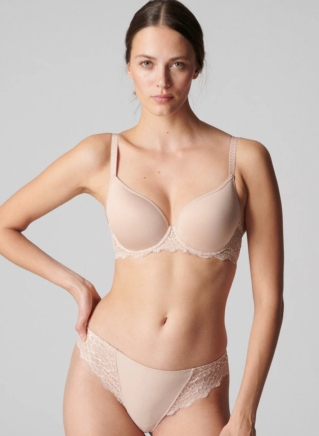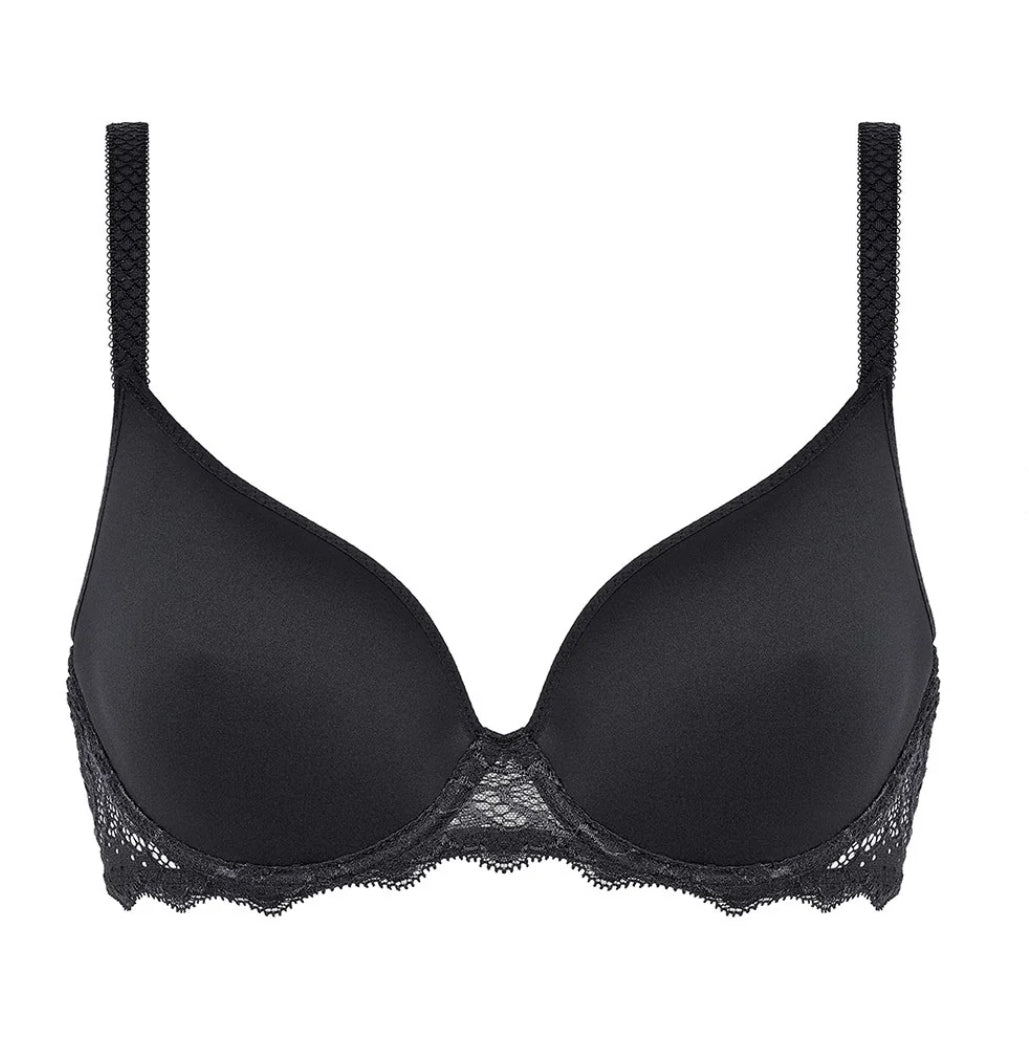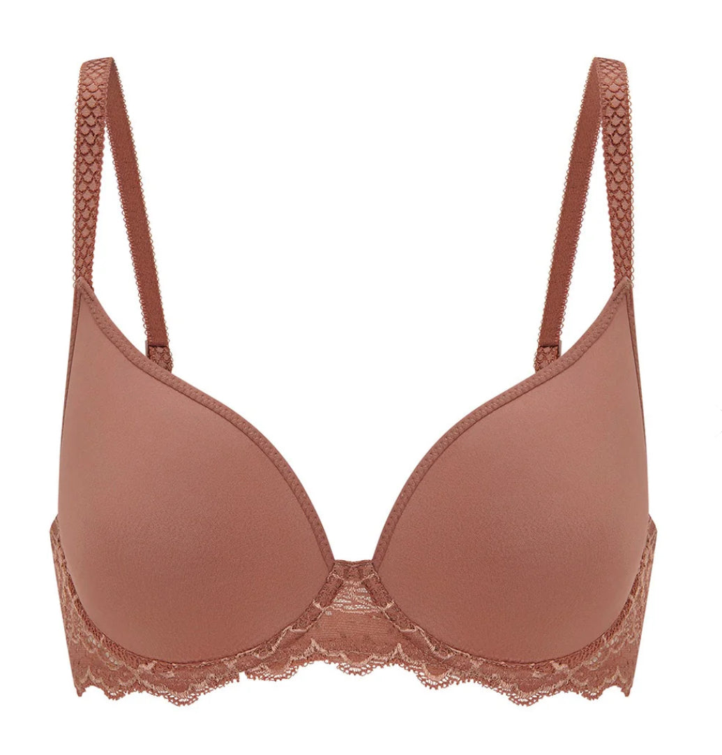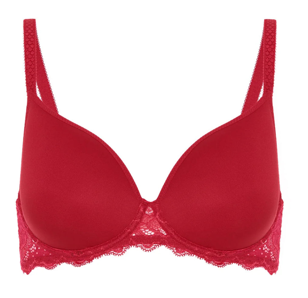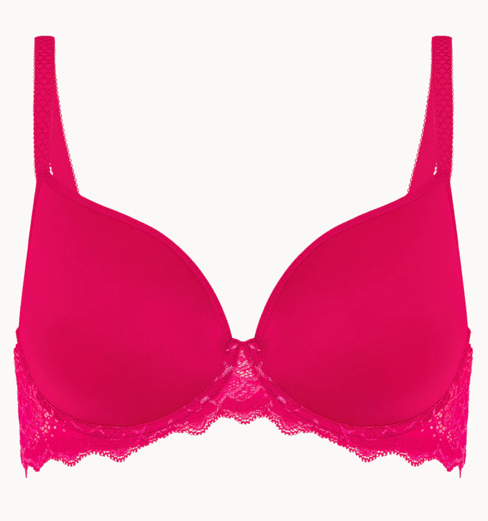 Meet your new favorite T-shirt bra. Revolutionary spacer technology delivers a curve-hugging fit with a velvety soft interior that’s live-in-all-day comfortable. This fresh take on the French T-shirt bra is a technical masterpiece gone chic: seamless cups, plunging neckline, ultra-soft stretch lace, scalloped edges, u-shaped ballet back, and fully adjustable straps.